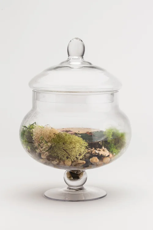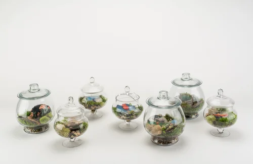 Glass terrariums, image transfer on wood, moss, lichen, rocks